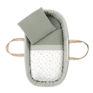 El Capazo de palma con estampados en verde y blanco está indicado para los primeros meses de vida del bebé.