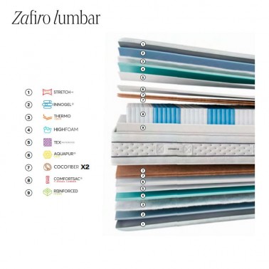 - Capa de Cocofiber x 2 en el modelo Zafiro Lumbar: Fibra natural de coco prensada, resistente y altamente transpirable. Aporta firmeza adicional, refuerza estabilidad del colchón y mejora la circulación del aire, evitando la acumulación de humedad.