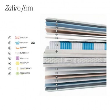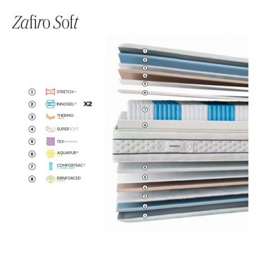 - Núcleo de muelles ensacados tecnología ComfortSac: Es una carcasa de alta precisón diseñada para un descanso más ergonómico y personalizado. Su estructura incorpora 7 zonas de confort creadas con diferentes calibres de alambre favoreciendo una correcta alineación de la columna. Se alivian presiones, mejora la postura y reduce interrupciones durante el sueño. La tecnología ComfortSac distribuye 1500 muelles en colchón de 150x190. Su altura es de 17 cm.