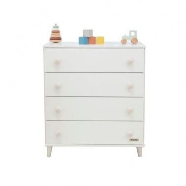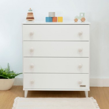 Una cómoda en blanco con cuatro cajones. Diseño sencillo y elegante.