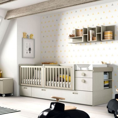 Cuna convertible para dos con zona de cambiador para el cambio de pañal y que se convierte en un dormitorio completo.