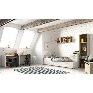 Cuando se aplica la desconversión obtendrás una cama doble, una mesita, un escritorio doble y librería, para que cada uno tenga su lugar de trabajo.