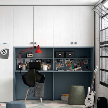 Mesa escritorio para habitaciones juveniles con puente en la parte superior.
