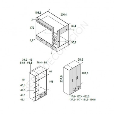✔ Habitación completa formada litera Lur con dos cajones inferiores y armario de tres puertas y dos cajones.