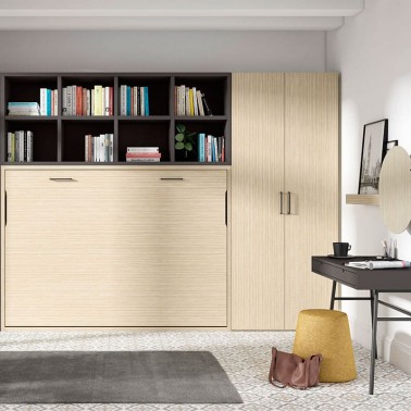 Gana espacio con esta habitación con cama abatible con estantería en la parte superior y armario con baldas interiores.