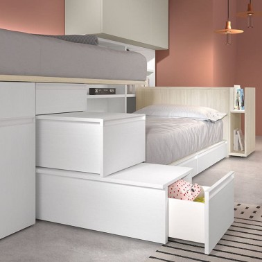 Conjunto de litera tren compacta, con cama superior y cama inferior con dos cajones.