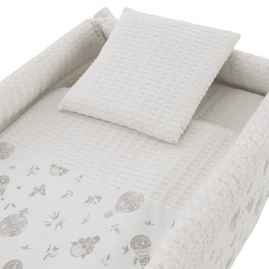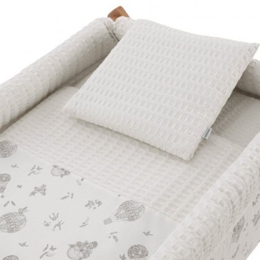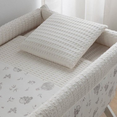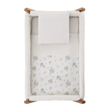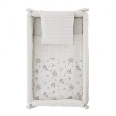 Incluye colchón, somier de madera de 5mm, soporte de madera lacada en blanco y su vestidura cosida que incluye saco de minicuna.