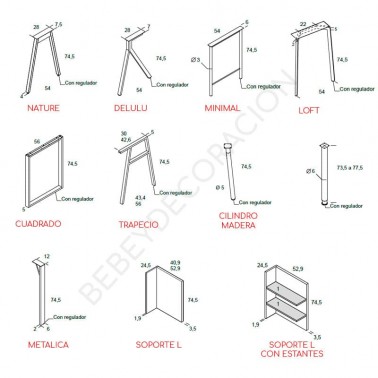 TRAPECIO: pata metálica color blanco, se puede lacar en color liso o lacado (elegir en desplegable COLOR) . No admite especiales. Necesitas 1 soporte por lado.